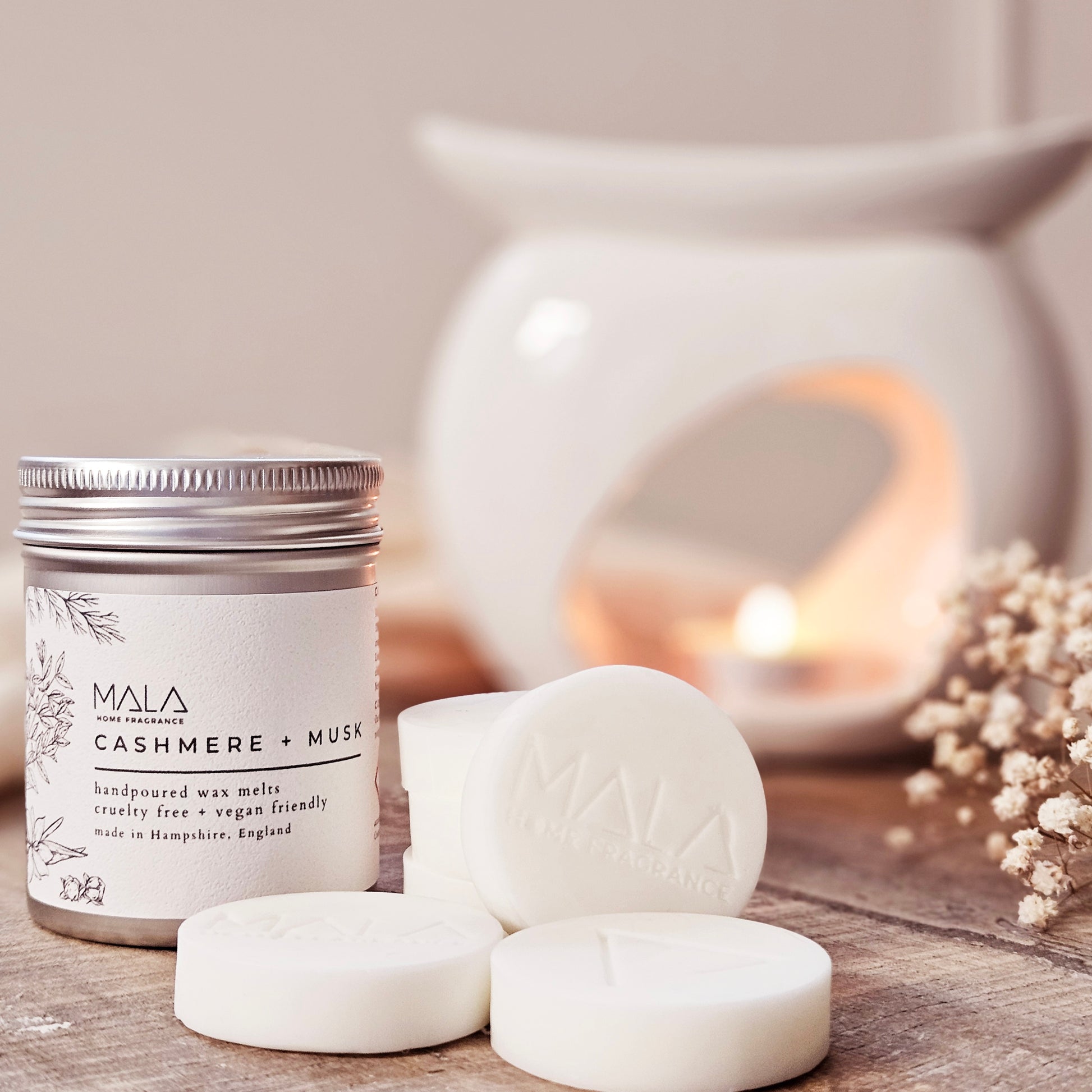 A tin contains 6 signature MALA wax melt discs with a minimum of 10-12 hours of fragrance per disc