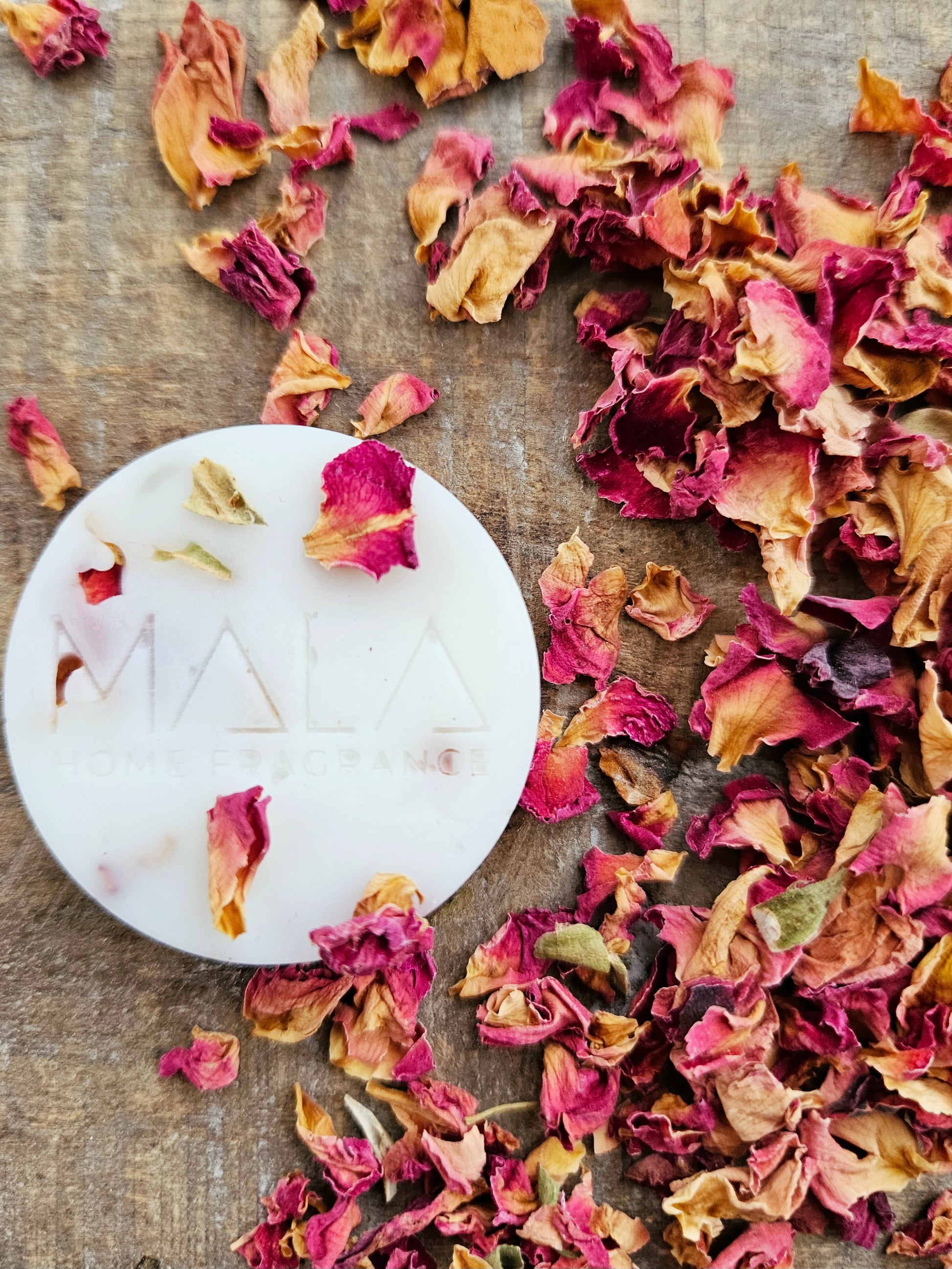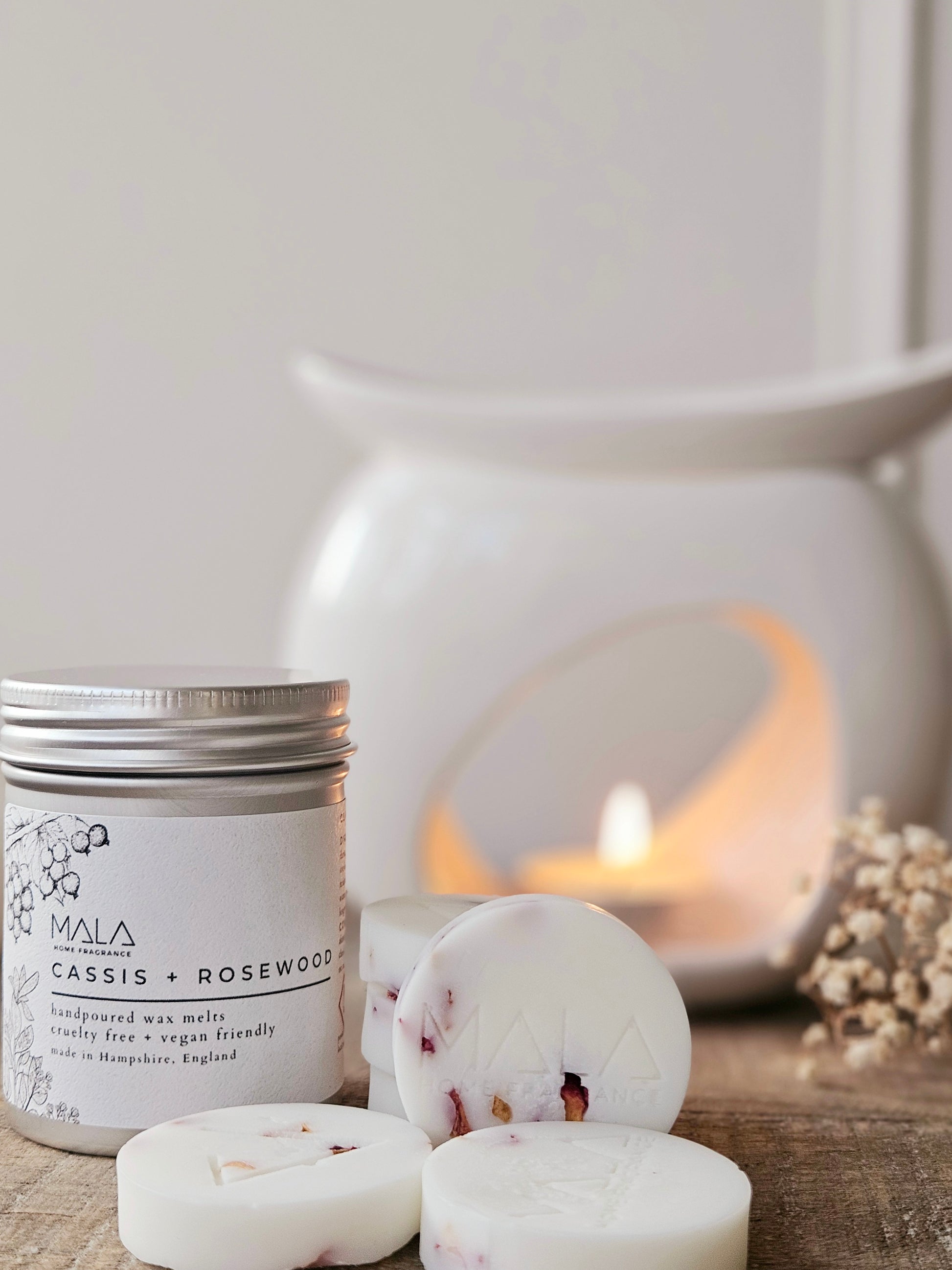 A tin contains 6 signature MALA wax melt discs with a minimum of 10-12 hours of fragrance per disc