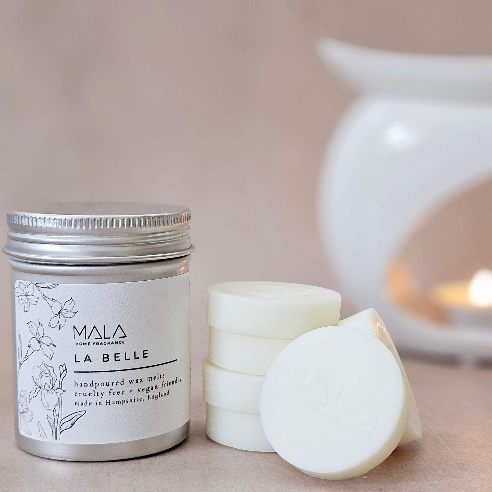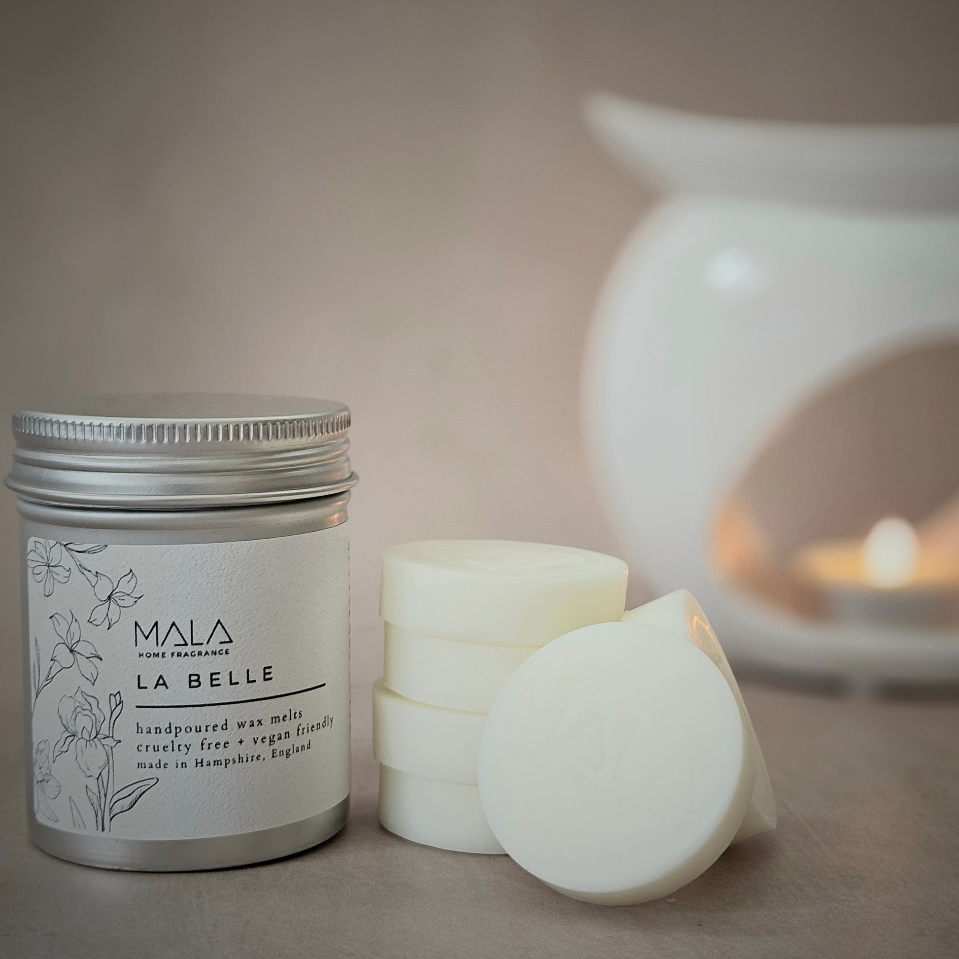 A tin contains 6 signature MALA wax melt discs with a minimum of 10-12 hours of fragrance per disc