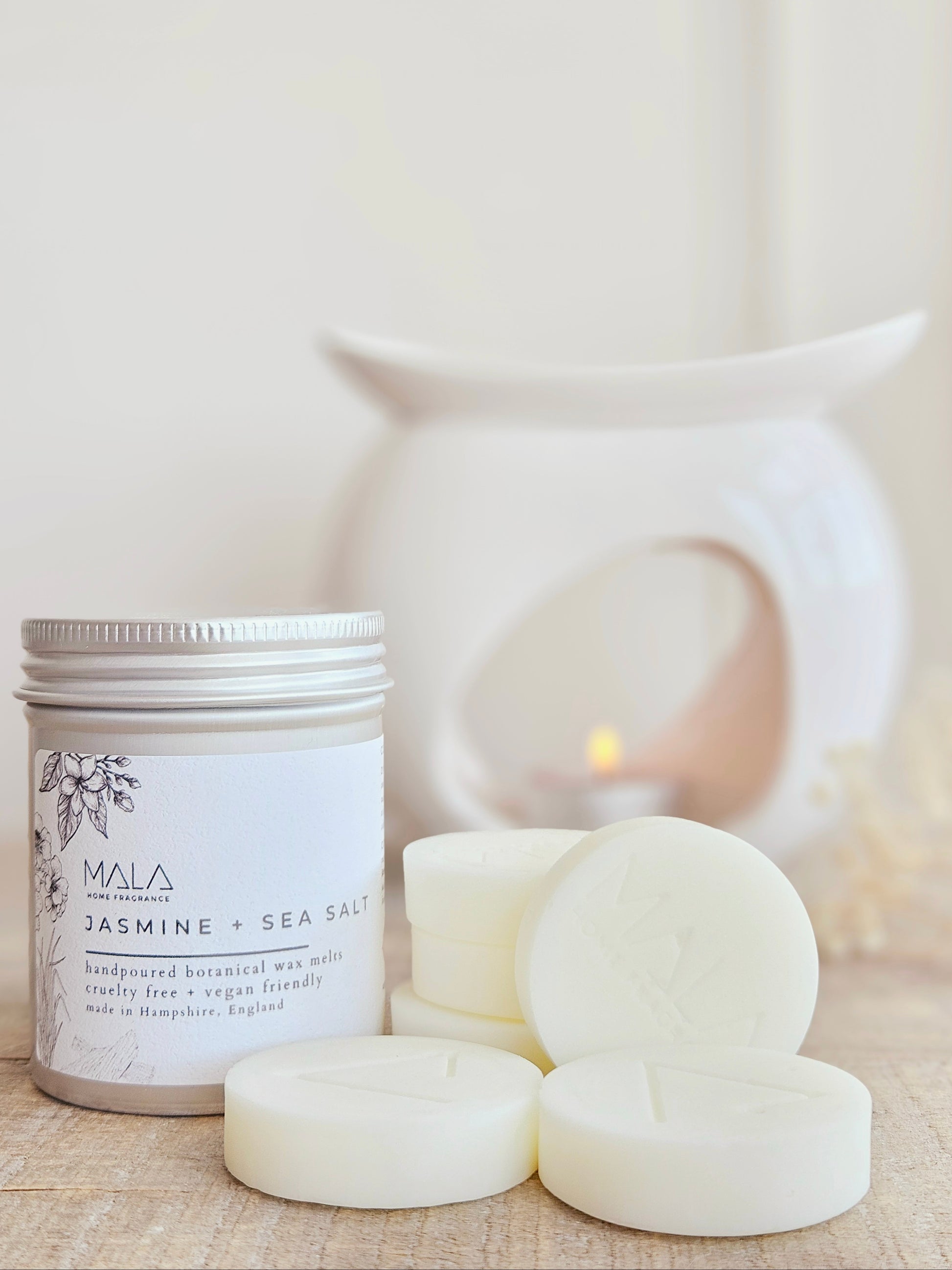 A tin contains 6 signature MALA wax melt discs with a minimum of 10-12 hours of fragrance per disc