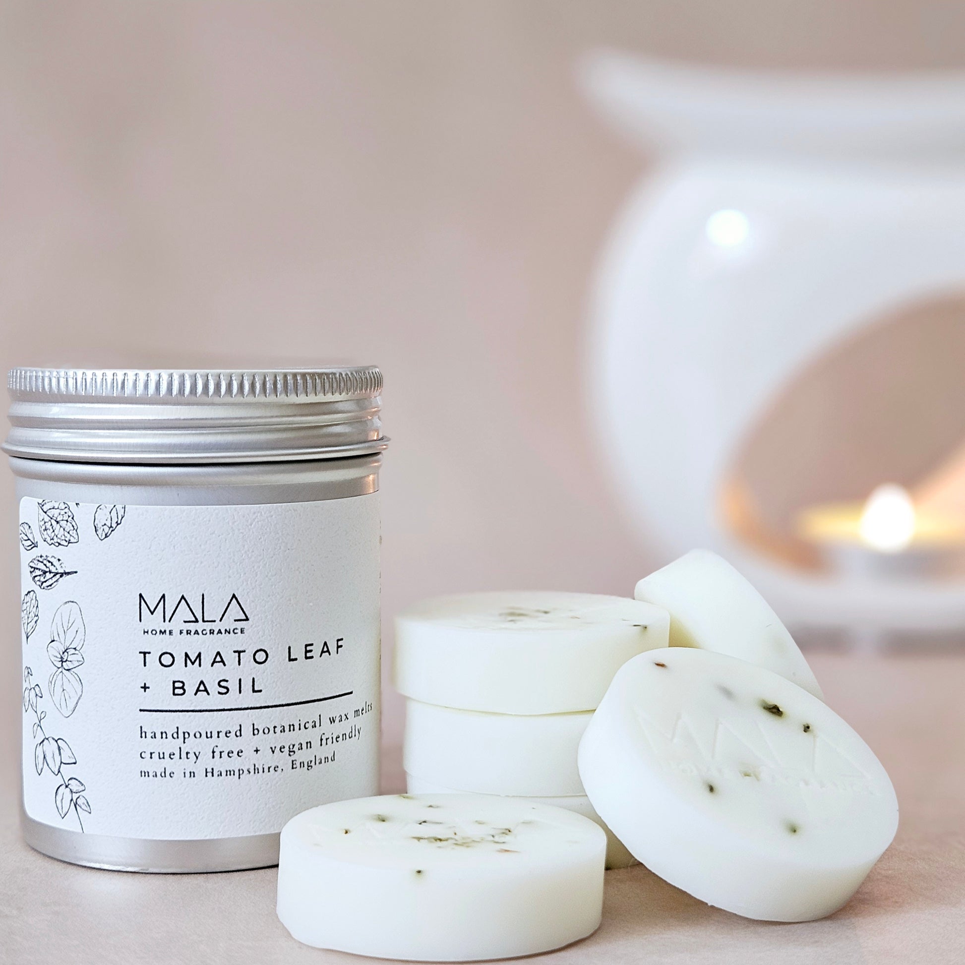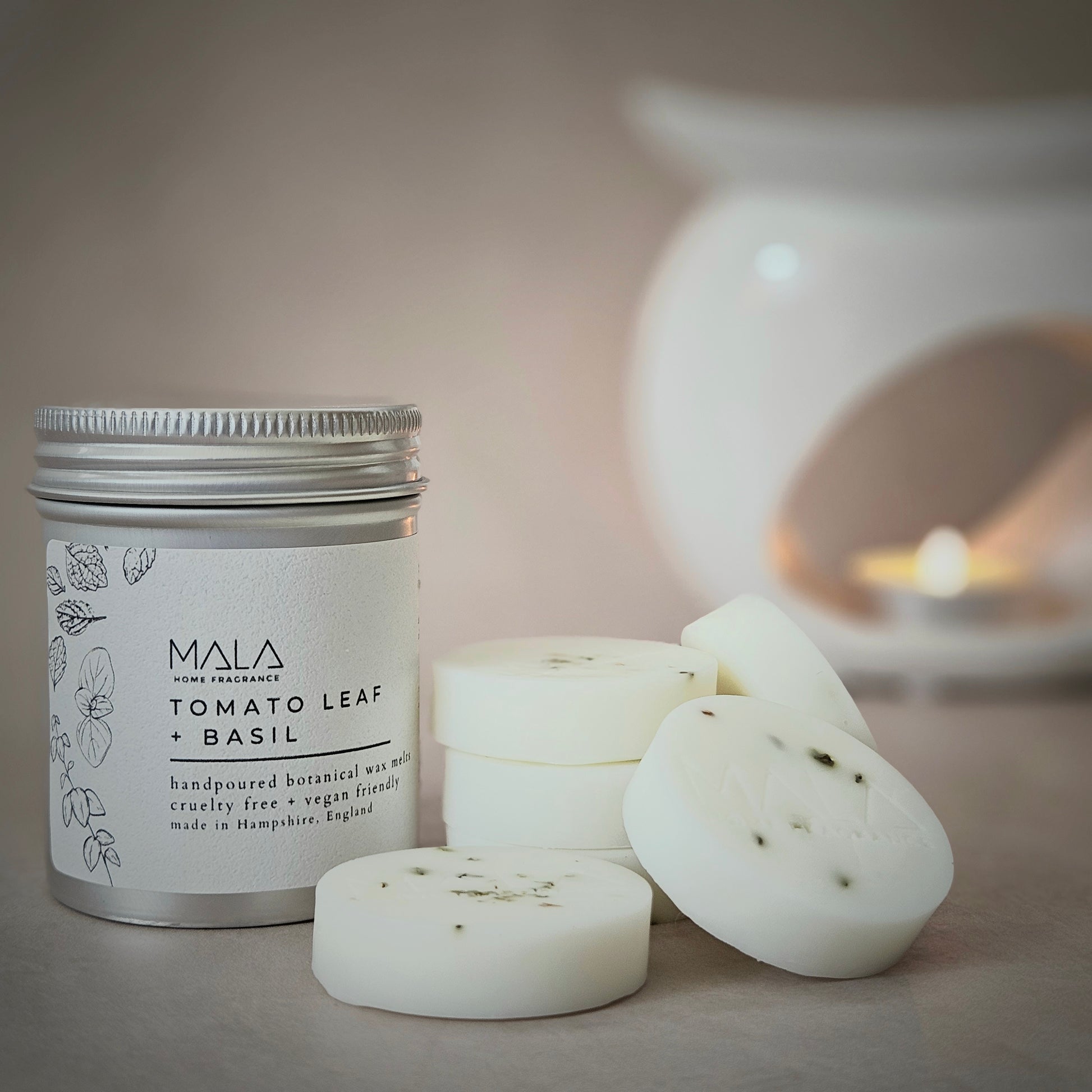 A tin contains 6 signature MALA wax melt discs with a minimum of 10-12 hours of fragrance per disc